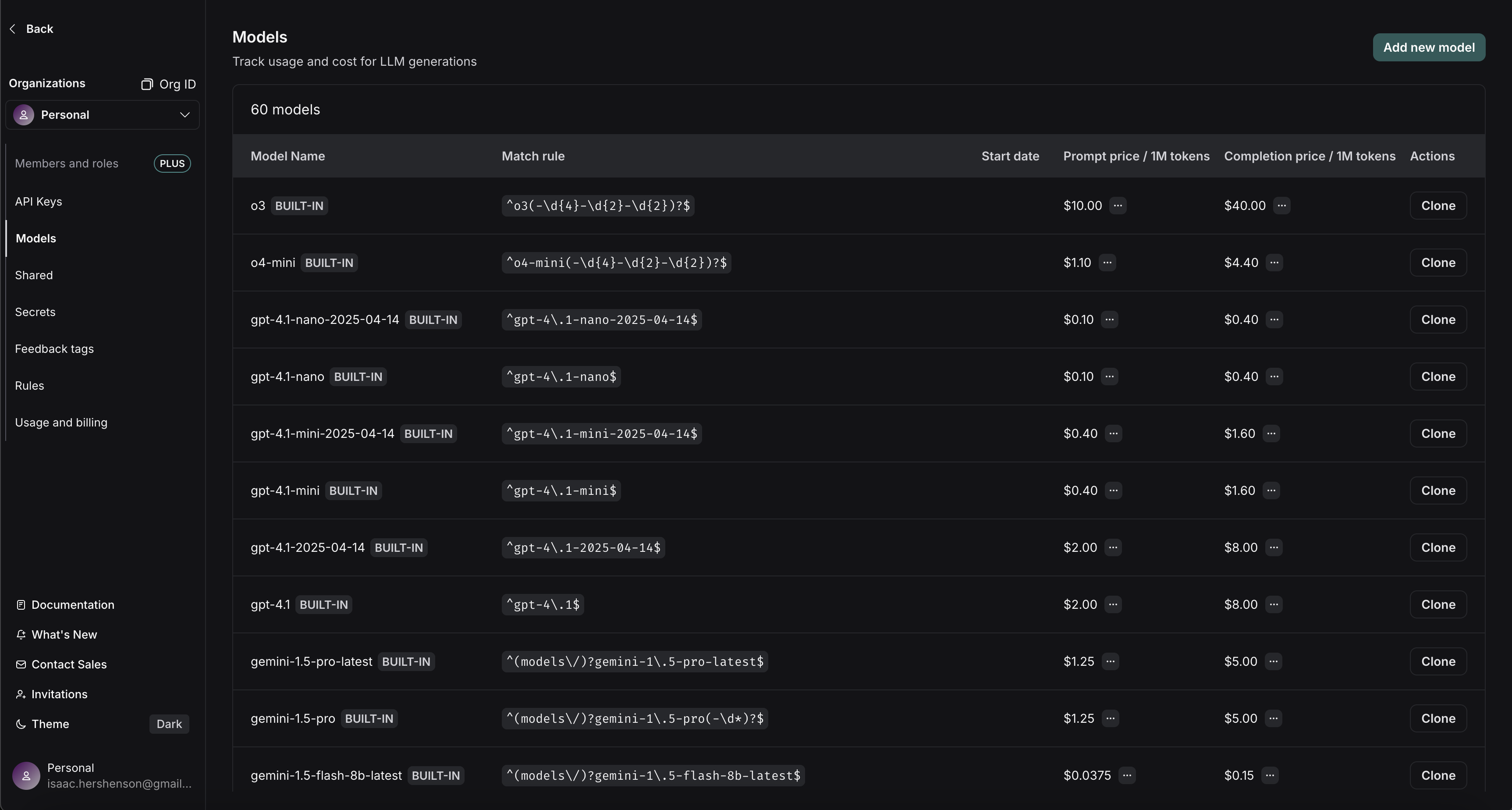 Please note that updates to the model pricing map are will not be reflected in the costs for traces already logged. We do not currently support backfilling model pricing changes.